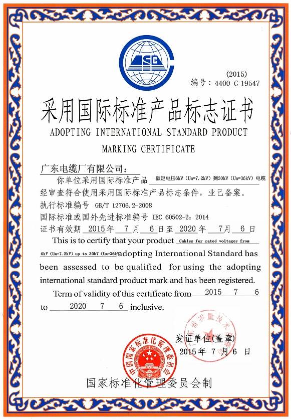 广东省采用国际标准产品认可证书(6-30kV)