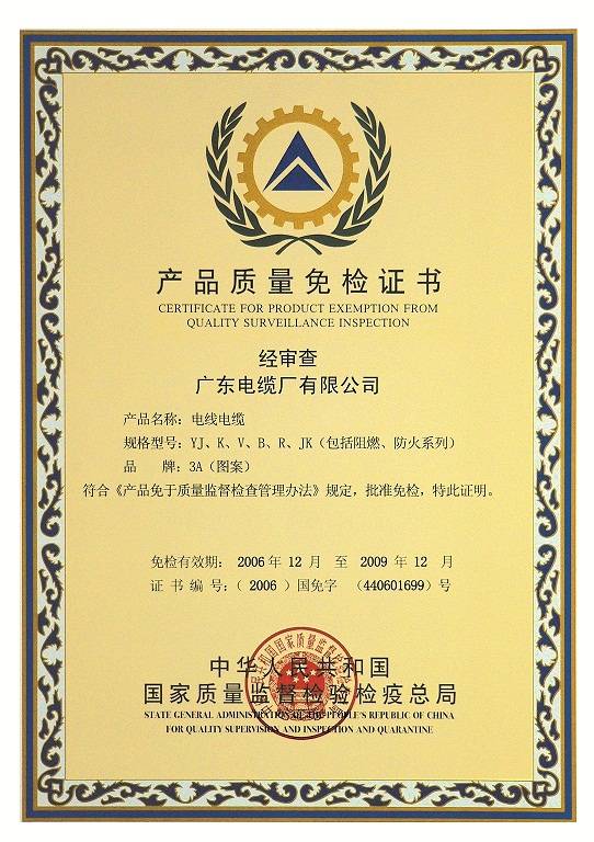 产品质量免检证书