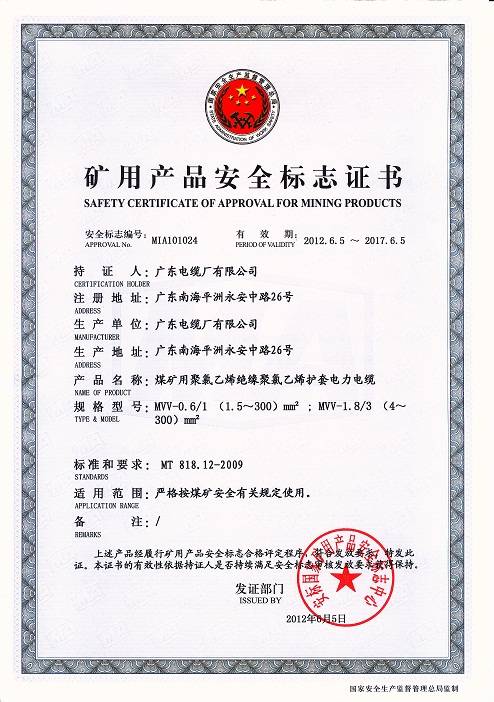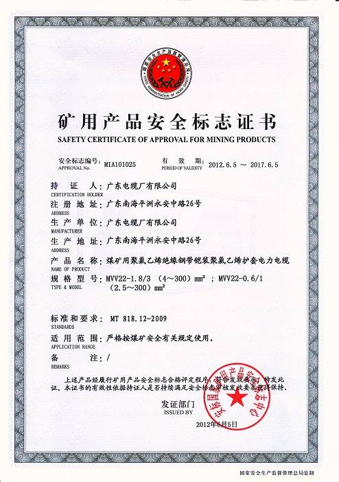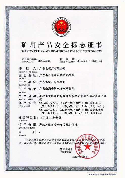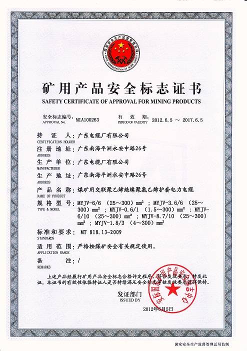 广东省采用国际标准产品认可证书(1-3kV)